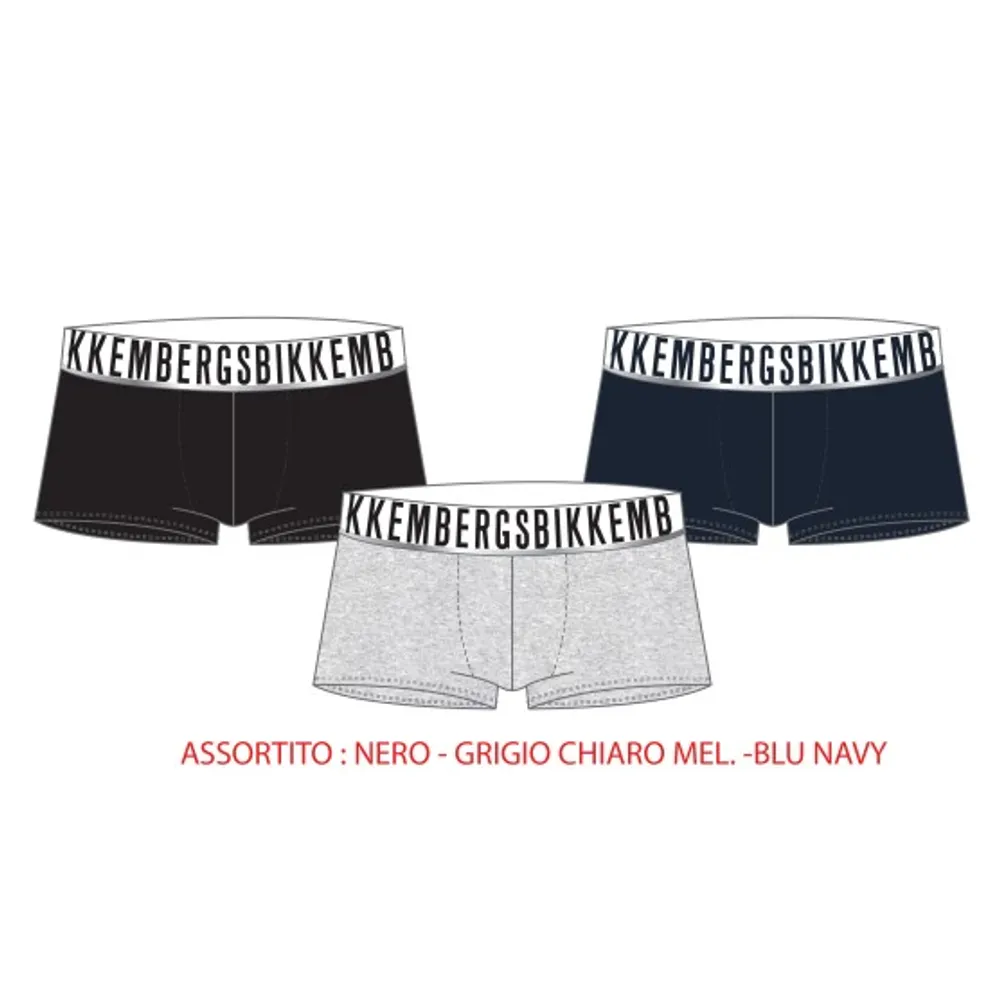 3PACK boxer BIKKEMBERGS realizzati in cotone elasticizzato di evidente qualità, vengono proposti nella variante assortita colore nero, blu e grigio chiaro. Elastico esterno con logo BIKKEMBERGS. Ottimo rapporto qualità prezzo! COMPOSIZIONE 95% cotone, 5% elastan.